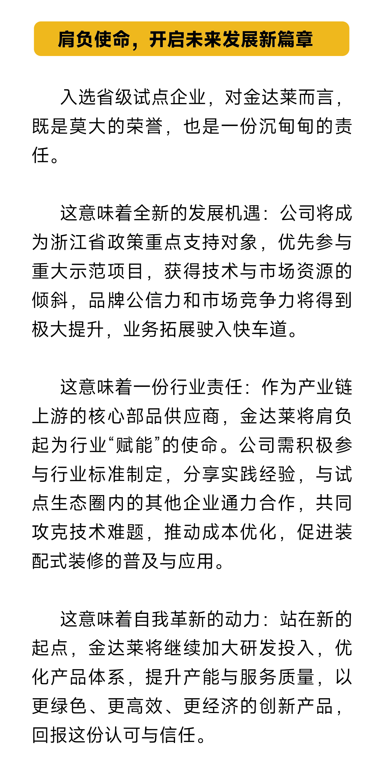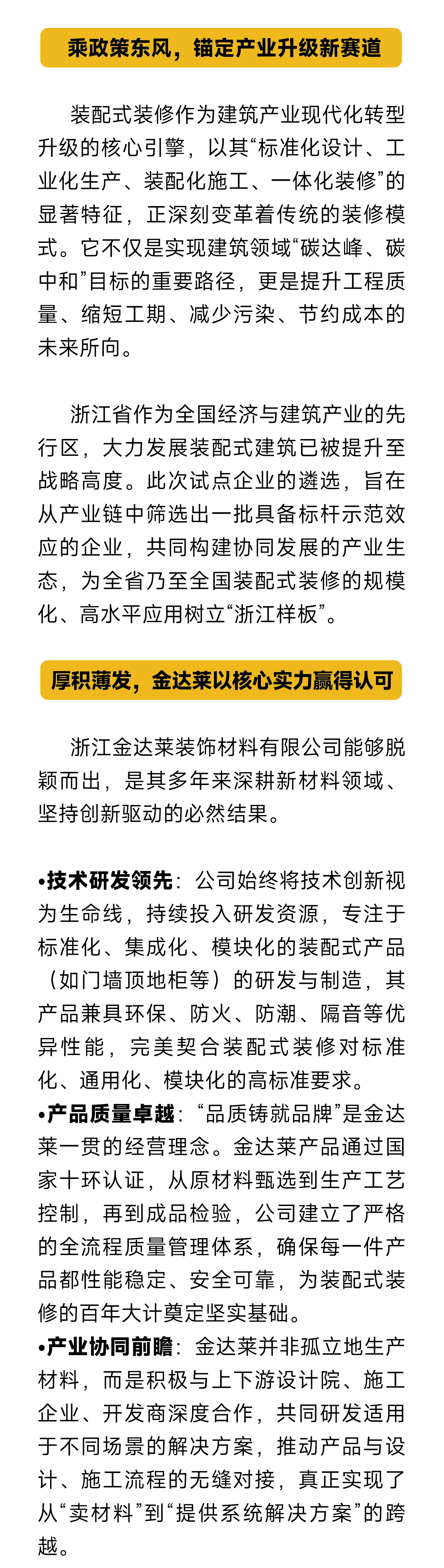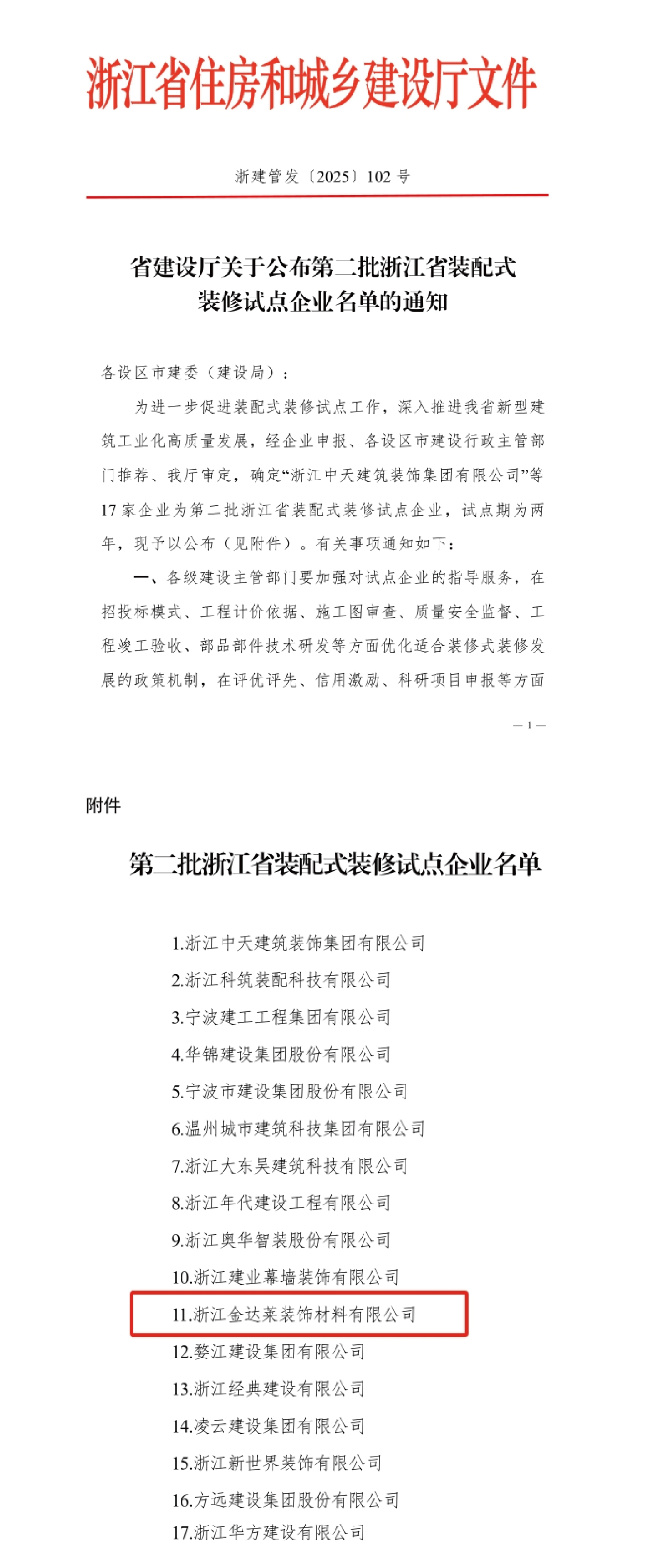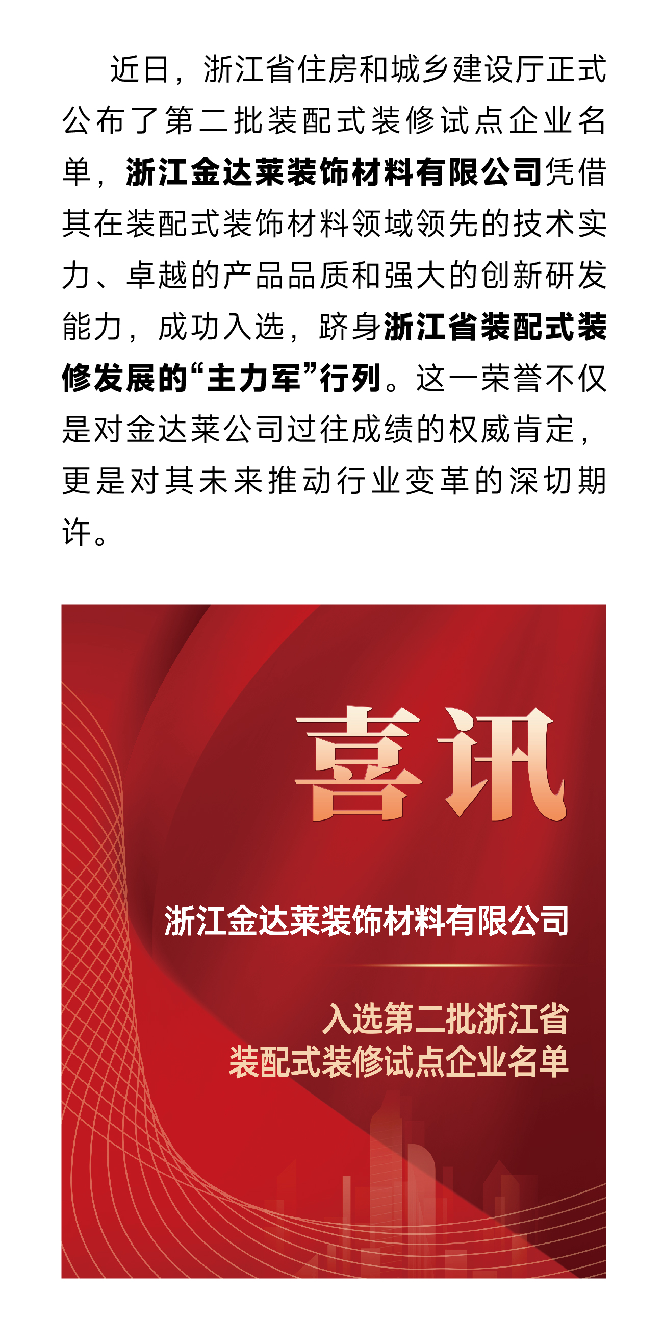 荣誉时刻 | 卧赛旧改母公司浙江金达莱装饰材料有限公司成功入选 浙江省第二批装配式装修试点企业名单