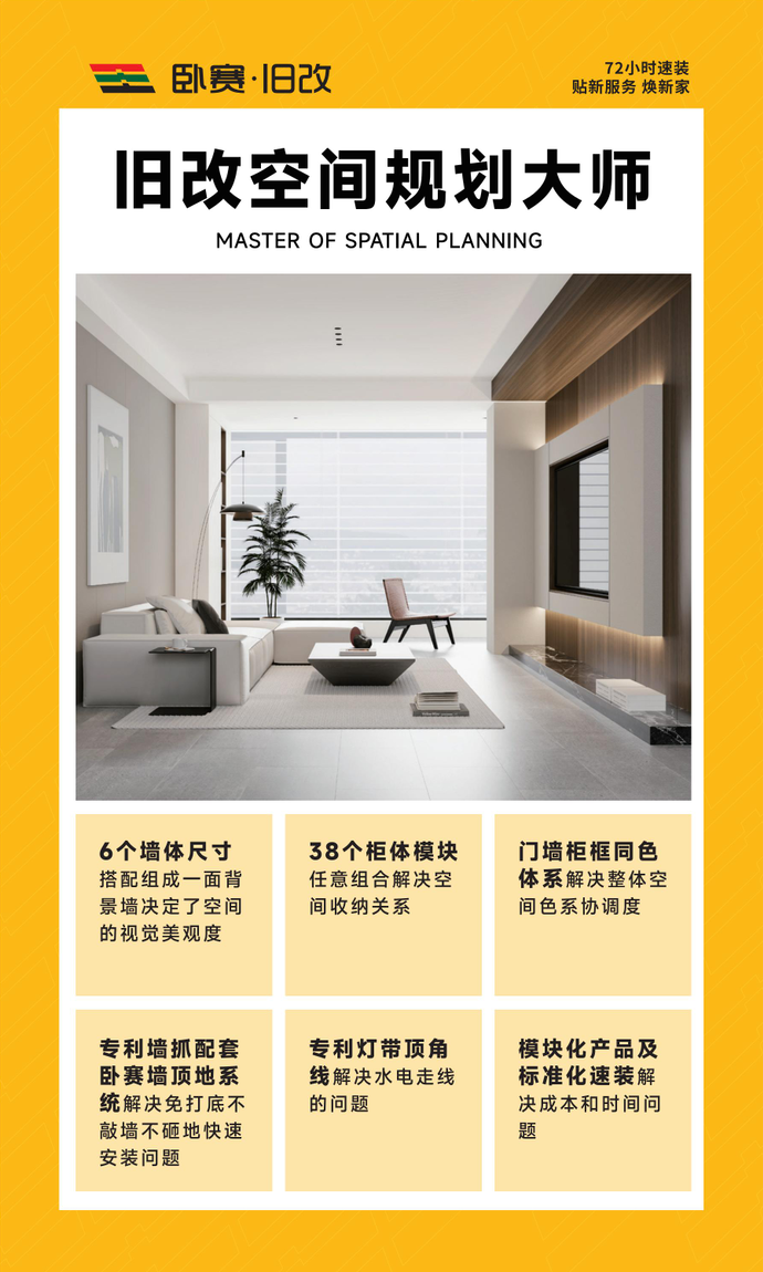 我们认为,专业做旧改,必须研发生产与之匹配的旧改产品体系。卧赛旧改经过十年的研发,已经打造了一套完整的旧改产品体系,涵盖了柜体、墙体、顶地等各个方面。我们的产品不仅具备标准化、模块化的特点,还能根据不同的旧改场景进行灵活调整,真正实现了“小而全”的需求匹配。与传统装修产品相比,我们的产品更加注重实用性与经济性,能够有效降低旧改成本,为客户省钱。